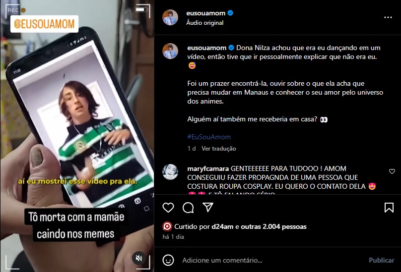 “Dona Nilza achou que era eu dançando em um vídeo, então tive que ir pessoalmente explicar que não era eu. Foi um prazer encontrá-la, ouvir sobre o que ela acha que precisa mudar em Manaus e conhecer o seu amor pelo universo dos animes.”, Amom nas redes sociais.