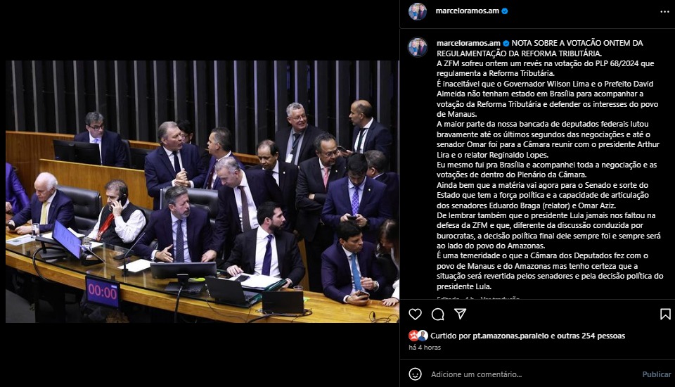 Marcelo Ramos, ex-deputado federal, também foi a Brasília e lamentou nas redes o revés que a bancada federal enfrentou. Ramos acredita que o senado, por meio das articulações de Omar Aziz (PSD) e Eduardo Braga (MDB) conseguirão reverter a situação da ZFM no congresso.