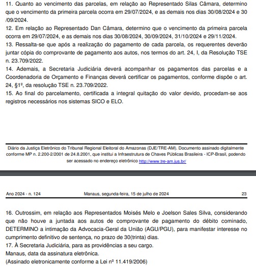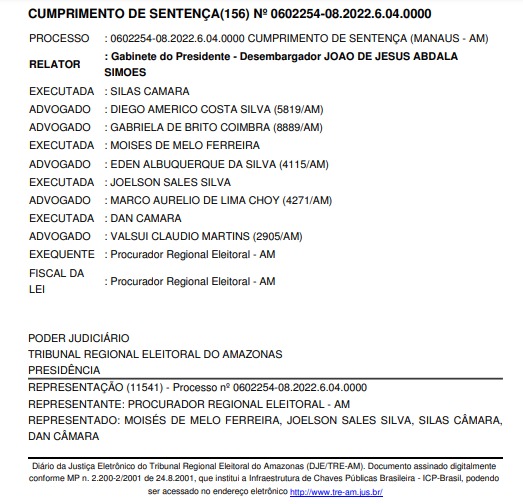 Segundo documentos oficiais, a representação foi ajuizada pelo Ministério Público Eleitoral e o pedido foi julgado procedente. A decisão foi publicada nesta segunda-feira, 15, e tem como relator o desembargador e presidente do TRE-AM, João de Jesus Abdala Simões.