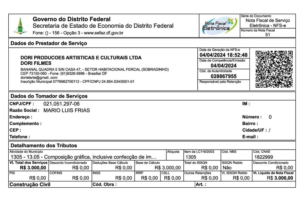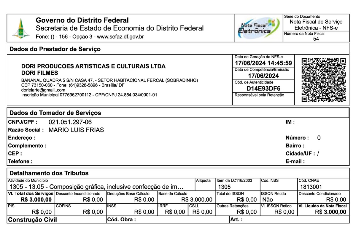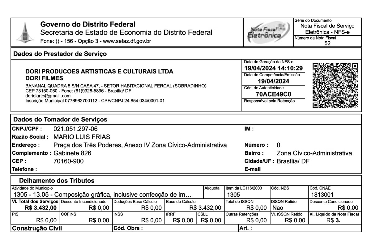 As outras quatro notas fiscais chegam a informar como motivo do pagamento à produtora de filmes um serviço distinto, de gráfica. O deputado descreve ter impresso 36.100 folders com o cineasta em um período de 74 dias.