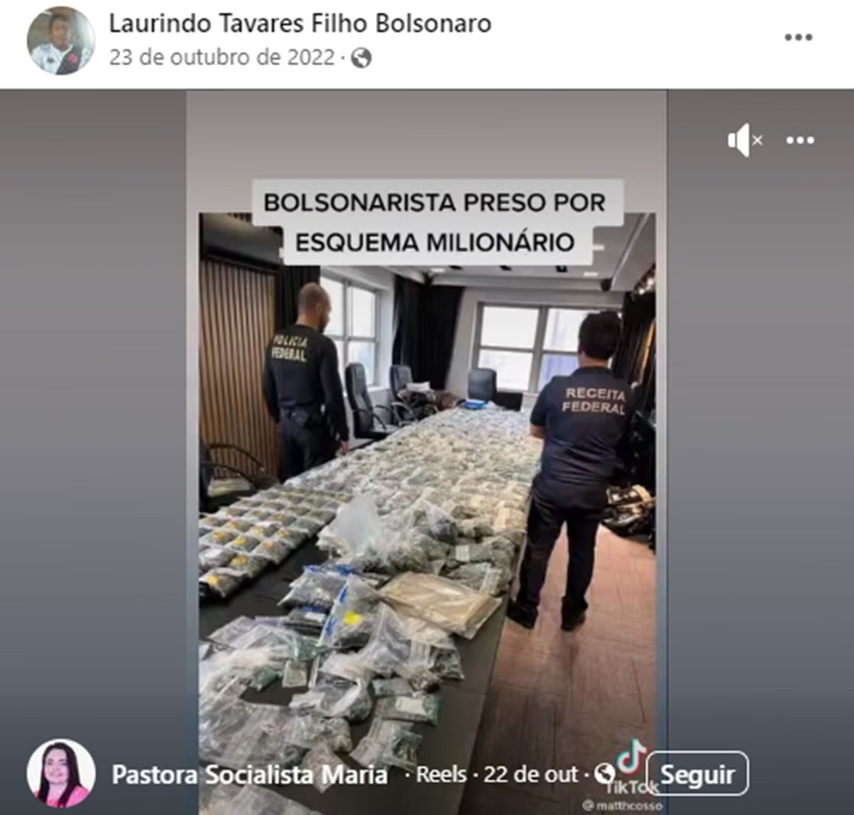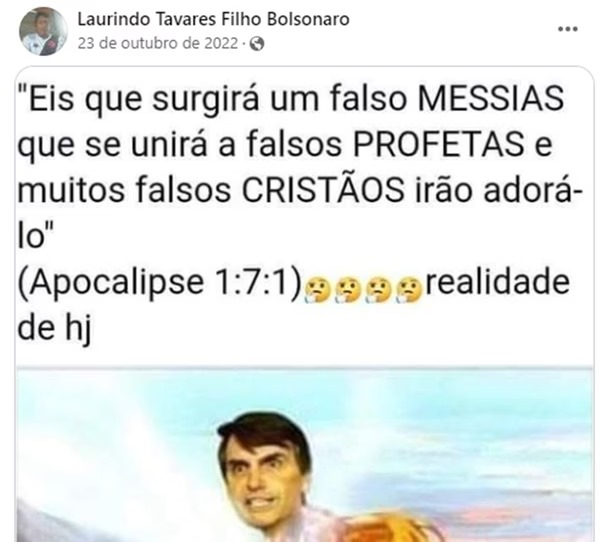 “Eis que surgirá um falso Messias que se unirá a falsos profetas e muitos cristãos irão adorá-lo”, diz um post compartilhado em 23 de outubro de 2022, às vésperas das eleições presidenciais. A frase é acompanhada de uma montagem com o ex-presidente e figuras como Olavo de Carvalho e Alan dos Santos.