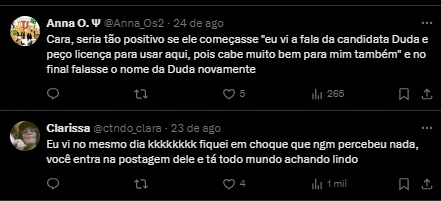 Duda publicou um vídeo em sua conta no Instagram na última segunda-feira (19/8), se apresentando como candidata e destacando que muitos eleitores não pensaram nela, pois “é diferente mesmo”. No dia seguinte, o candidato à prefeito em Manaus publicou um vídeo idêntico em suas redes sociais.