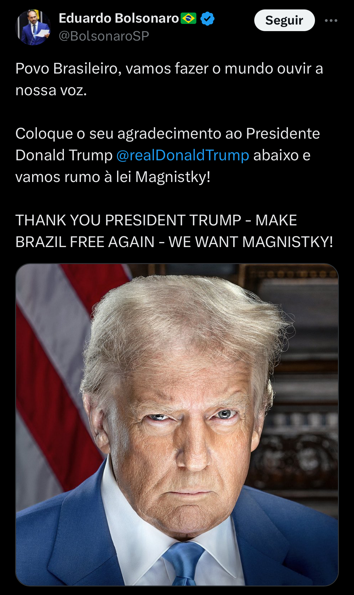 “Coloque o seu agradecimento ao Presidente Donald Trump abaixo e vamos rumo à Lei Magnitsky!”, escreveu o parlamentar.