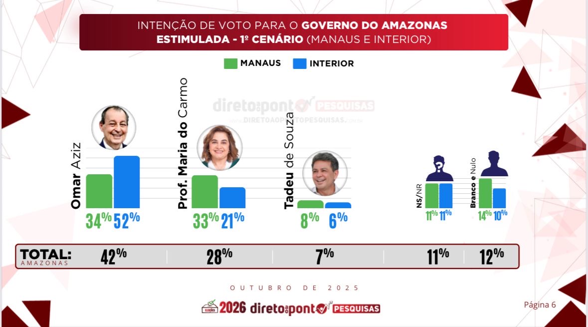 A pesquisa ouviu 2.024 eleitores presencialmente, entre os dias 1º e 8 de outubro, em Manaus e 16 municípios do interior — entre eles Parintins, Coari, Manacapuru, Itacoatiara e Tefé. A margem de erro é de 2,25 pontos percentuais, para mais ou para menos, e o nível de confiança é de 95,5%.