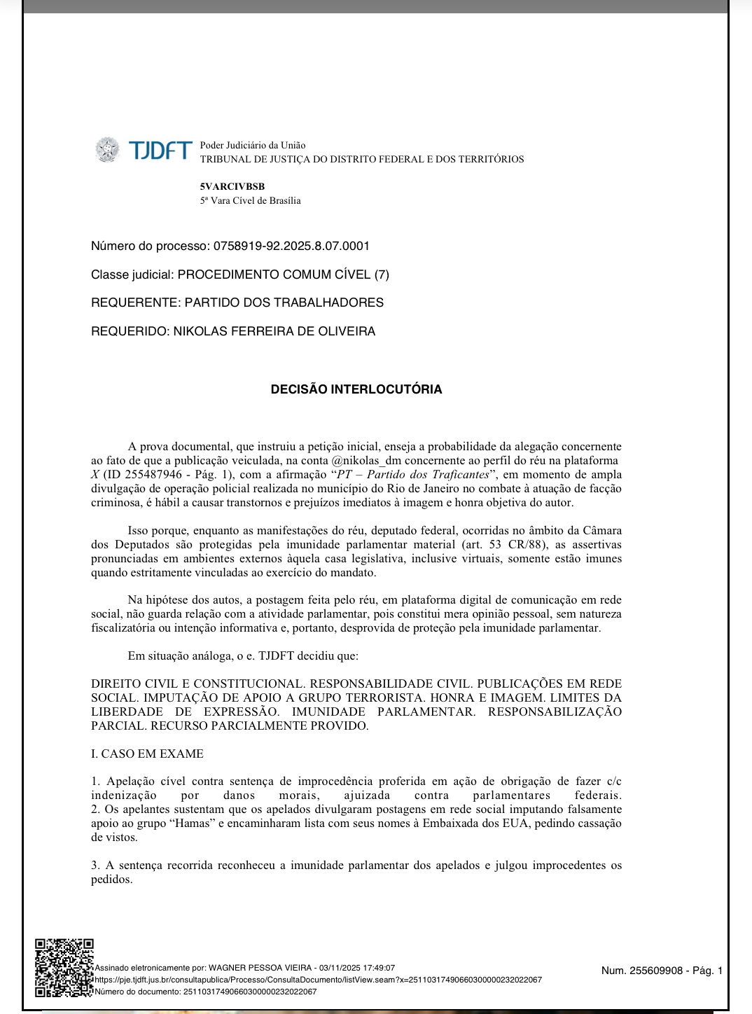 A decisão faz parte de uma ação movida pelo PT contra parlamentares bolsonaristas que associaram o partido ao crime organizado nas redes sociais. Além de Nikolas, também foram citados Bia Kicis (PL-DF), Gustavo Gayer (PL-GO) e Carlos Jordy (PL-RJ).