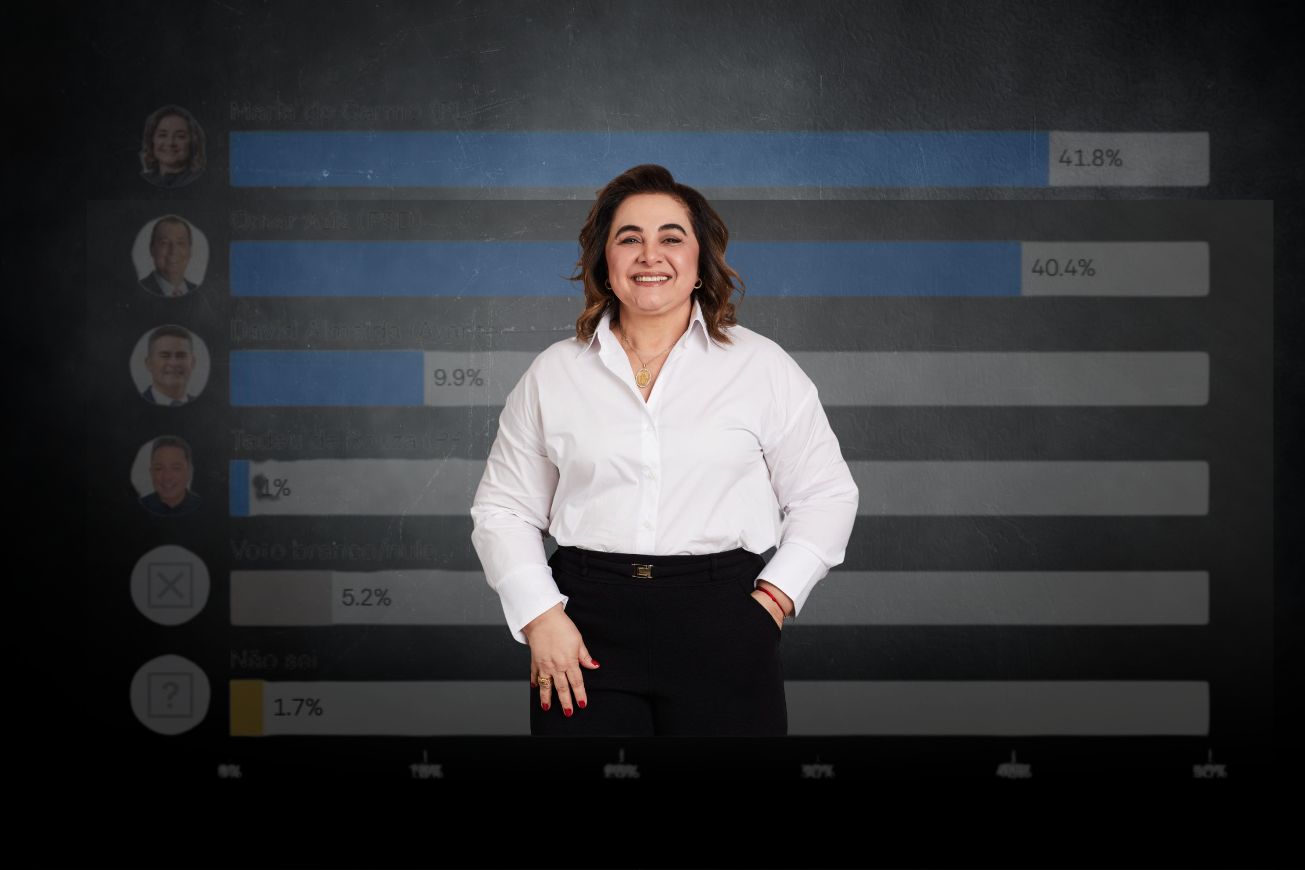 De acordo com os dados, Maria do Carmo soma 41,8%, seguida pelo senador Omar Aziz (PSD), com 40,4%. O prefeito de Manaus, David Almeida (Avante), aparece com 9,9%, enquanto Tadeu de Souza (PP) registra 1%. Brancos e nulos somam 5,2%, e os indecisos, 1,7%.