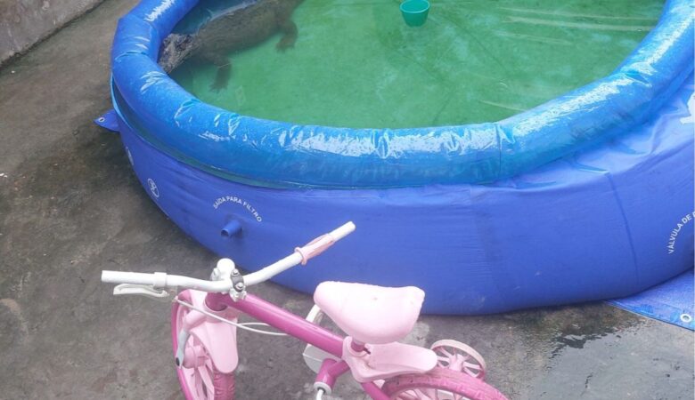Jacaré é encontrado dentro de piscina de plástico em casa na zona Leste de Manaus